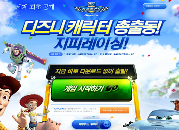또, 8월에는 디즈니∙픽사와 계약을 체결해 세계 최고의 인기캐릭터들을 게임에 활용하게 된 소식을 전하기도 했다. 다음은 지피레이싱의 1차 CBT를 플레이한 스크린샷과 간단한 후기다.