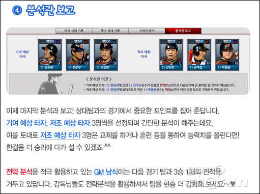 여기에 분석관이 등장해 현재 우리 팀의 부족한 부분과 상대팀과 비교한 결과를 분석해주기에 분석관의 말만 들으면 어느 정도 승률은 보장되는 것.