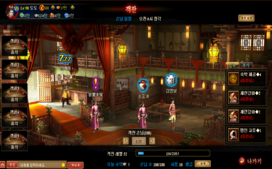 객잔에는 매일 일정 시간에 손님이 방문한다. 한번에 방문할 수 있는 손님의 수는 최대 100명이며 각 손님의 요구에 맞게 술 접대, 숙박, 주사위 게임 등을 제공하면 문파 경영에 필요한 은자를 획득할 수 있다.
