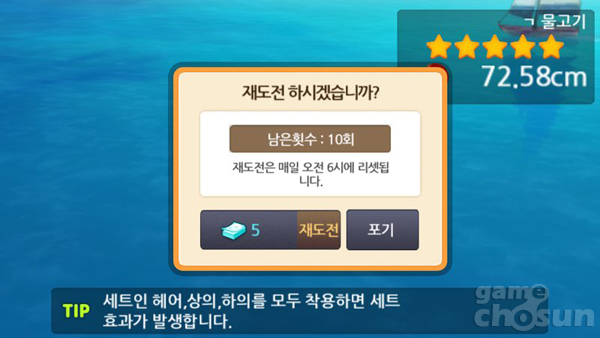 또한 게이머의 장비에 따라 높은 등급의 물고기가 등장할 확률이 높아지거나 크리티컬 확률 증가 등 낚시에 도움이 되는 능력치가 증가한다.