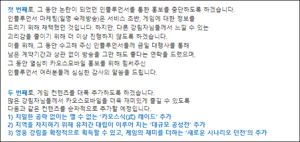 인삿말이 발표되자 인플루언서들은 속속 카오스모바일 방송 중지를 선언하고 있다.