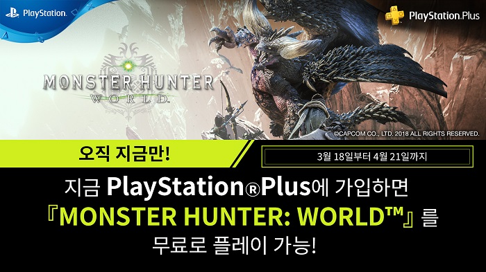 3월 18일(수)부터 4월 21일(화) 사이에 PS Plus를 이용하는 가입자는 해당 기간 동안 PS Store에서 PS4™용 ‘Monster Hunter: World™’를 무료 게임으로 다운받을 수 있다. 기존 PS Plus 가입자는 물론이고, 해당 기간 동안 새롭게 PS Plus에 가입한 고객도 모두 PS Plus 무료 게임을 받을 수 있으며, 한번 다운로드 받은 PS Plus 무료 게임은 PS Plus 가입 기간 동안 무제한으로 플레이가 가능하다.