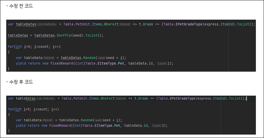 111퍼센트 측에서는 펫 뽑기의 로직에서 일단 등급이 먼저 결정되는 과정에는 문제가 없으나 같은 등급 내에서 어떤 펫이 등장하는지를 결정할 때 순서를 섞는 셔플 알고리즘 코드에 오류가 있었고, 그에 따라 셔플을 진행하는 과정에서 난수 생성 초기값(시드)에 배정된 특정 펫들이 다른 펫이 나오는 상황에서 순서를 밀어내는 현상이 발생했다고 설명했다.
