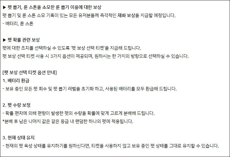 한편, 이에 대한 보상안으로 내놓은 내용에 대해서도 이용자들은 의견이 분분한 상태다. 펫 뽑기와 룬 뽑기 이용 내역이 있는 이들에게 일괄 지급되는 배터리 및 룬스톤 보상에 대해서는 별다른 이야기가 나오고 있지 않지만 이미 펫을 충분히 뽑고 키워둔 이용자들에게는 보유하고 있는 펫을 전부 회수하고 자원을 초기화하여 다시 뽑고 키우는 선택지인 '배터리 환급'이나 펫 조각을 재배분하는 '펫 수량 보정'이라는 선택지가 결국에는 또 확률에 의거한 방안이라 달갑지 않다는 것이다.