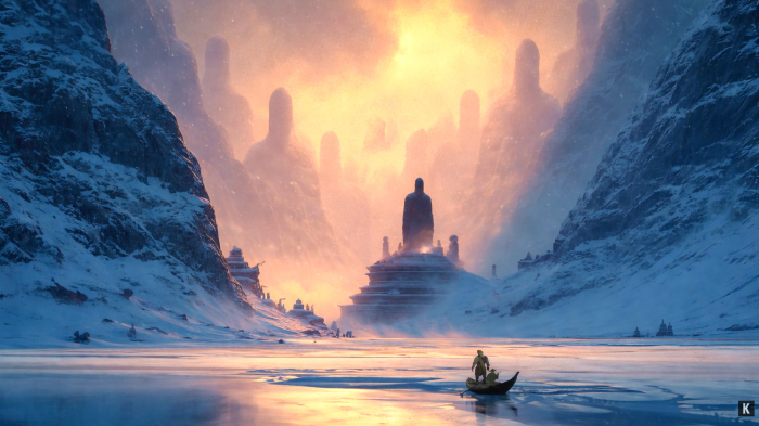 더 과감한 표현은 사실 배를 타고 강을 건너는 듯한 영웅왕의 모습이었습니다. 레콘은 밀도가 높아 물에 빠지면 살기 어려워 종족 단위로 공수증을 가지고 있거든요. 심지어 물을 물이라고 표현하지 않고 ‘그거’라고 부르고, 얕은 수면 아래 나무다리가 있는 것을 알고 있어도 건너지 못할 정도입니다. 그래서 배를 타고 강을 건너는 영웅왕의 모습은 꽤나 충격적으로 다가옵니다. 영웅왕이라 가능한 것일까요? 아니면 가능하기에 영웅왕인 것일까요?