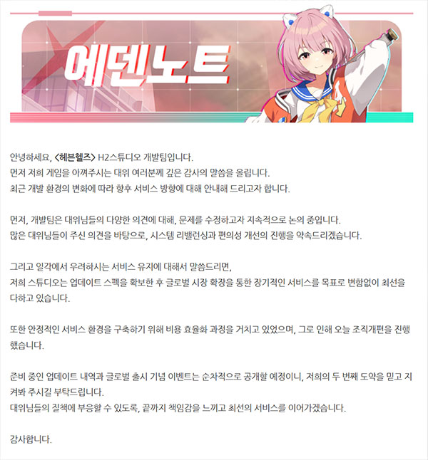 지난 13일, 클로버게임즈 H2스튜디오 개발팀은 공식 커뮤니티를 통해 '[개발팀의 편지] 개발 환경의 변화에 따른 향후 서비스 방향 안내'를 공지했다.