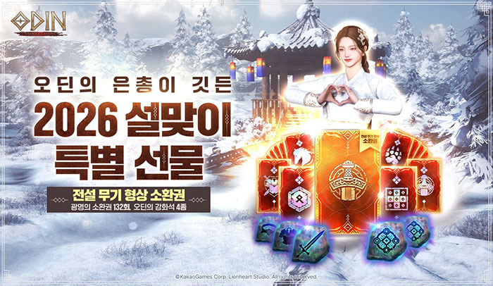 북유럽 신화 배경의 MMORPG ‘오딘: 발할라 라이징’에서는 설 연휴를 맞아 다양한 이벤트를 진행해 이용자 맞이에 나섰다. 먼저, 오는 25일까지 서비스 기간 중 최초로 ‘전설의 무기 형상 소환권’을 인게임 상점에서 무료 배포한다. 이어 3월 18일까지 출석 이벤트를 통해 ‘광명의 소환권’, ‘오딘의 무기/방어구/장신구 강화석’을 지급한다. 같은 기간 설날을 기념해 ‘유물’ 관련 미션을 수행한 이용자에게 ‘오딘의 유물 강화석’ 2개를 보상으로 제공한다. 이 밖에도 필드 혹은 정예 던전에서 획득한 ‘행운의 씨앗’을 ‘가온누리 외형 획득권’, ‘2026 설 복주머니’ 등 아이템으로 교환할 수 있다. 이와 함께, 16일부터 18일 설 연휴 3일간 게임에 접속한 이용자에게 ‘광명의 소환권’을 최대 66장 제공하는 이벤트를 마련해 명절 분위기를 한층 끌어올릴 예정이다.