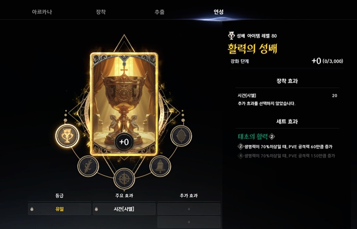 여기서 캐릭터의 장비 점수를 더욱 끌어올릴 수 있는 방법이 있는데, 바로 유일 등급 (노란색) 아르카나를 획득하는 것이다. 유일 아르나카는 필요없는 아르카나를 추출해 신비로운 결정으로 만들어서 획득이 가능한데, 유일 아르카나 1개를 연성하기 위해서는 신비로운 결정을 총 5개 모아야 한다.