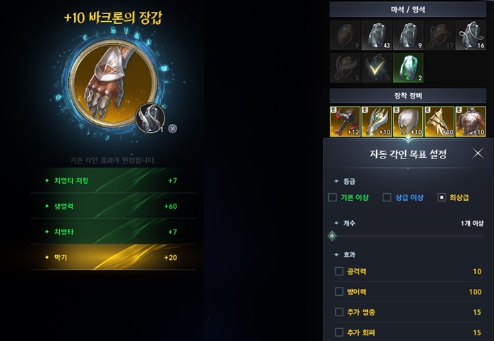 장비 마석 & 영석 각인은 어느 정도 장비 파밍이 완료됐음에도 불구하고 장비 점수 커트라인에 충족하지 못하는 경우 고려할만한 성장 요소다. 마석 & 영석 각인을 통해 유일 기준 최대 4개의 추가 능력치를 부여할 수 있는데, 일반 및 희귀(초록색) 등급의 마석 옵션은 장비 점수 증가량이 크지 않기에 대수롭지 않게 여길 수 있다.