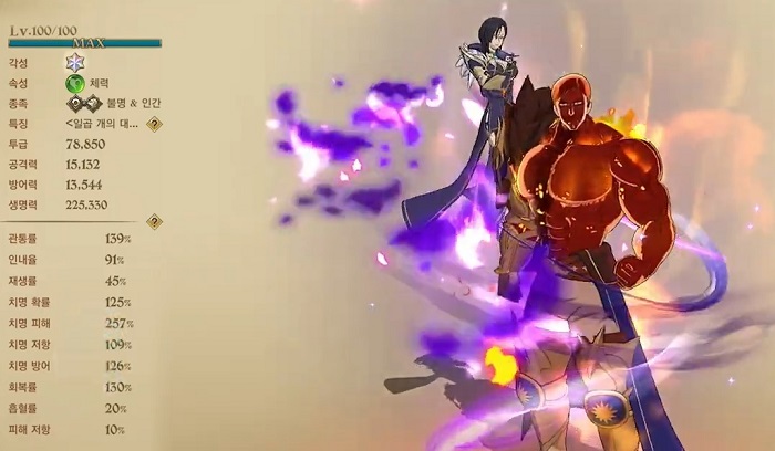 멀린 & 에스카노르의 핵심 개성 효과는 뇌우 스킬 발동 시, 그리고 자신이 적을 사망시키거나 적 턴에 칠대죄 / 인간 / 불명 종족 아군 영웅이 사망 시 부여되는 섬멸의 불꽃이라 할 수 있다. 섬멸의 불꽃은 공격 관련 능력이 부여될 뿐만 아니라, 자신에게 해당 효과가 부여돼 있을 때 생명력이 50% 이하로 감소하지 않는다. 아울러 필살기를 제외한 자신의 스킬 사용 시 해당 스킬의 계수가 무려 80% 증가한다.