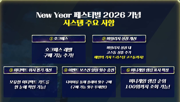 아울러 행운의 돌림통에서는 최대 2,000 다이아가 제공되는데, 행운의 돌림통은 1일 최대 3회까지 도전할 수 있다. 운세보기 이벤트도 다시 찾아오는데, 매일 다이아와 함께 초각성 코인까지 얻을 수 있다. 운세보기 이벤트는 1월 1일부터 7일간 개최되며 매일 1회 참여 가능하다.