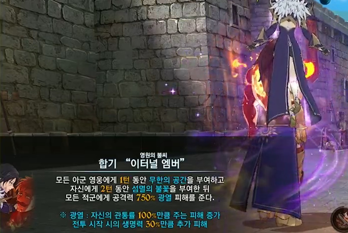 섬멸의 불꽃은 실제로 조건부 무적 효과라 할 수 있으며, 이와 더불어 무한의 공간 효과로 보호막까지 부여됨에 따라 매우 막강한 생존력을 보유했다. 여기에 단일 공격 스킬로 적 사망시킬 경우에 모든 적에게 추가 피해를 줄 수 있는 등 강력한 파괴력까지 갖추고 있는 등 신년 페스티벌 영웅으로서의 면모를 보여준다.