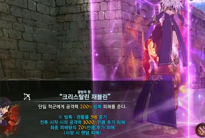 멀린 & 에스카노르의 스킬은 단일기와 전체기로 구성돼 있는데, 1번 스킬 '크리스탈린 재블린'은 단일 타겟을 공격하며 관통률 5배 증가 및 전투 시작 시 공격력 1000% 만큼 추가 피해, 최종 피해량의 70%만큼 추가 피해 효과의 빙폭 피해를 준다. (1랭크 기준)