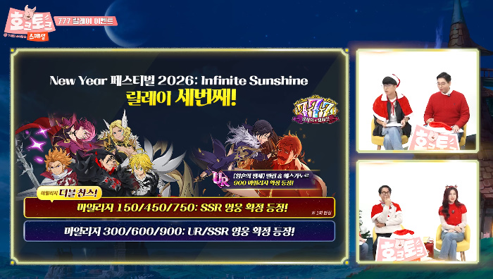 777 릴레이 이벤트의 세 번째 혜택은 신년 페스티벌 뽑기와 연계해 진행된다. 마일리지 150/ 450/ 750 달성 때마다 SSR 영웅을 확정으로 얻을 수 있으며, 마일리지 300/ 600/ 900 때마다 UR 및 SSR 영웅을 확정 획득 가능한 마일리지 더블 찬스가 마련됐다. 아울러 SSR 영웅의 경우 100레벨 풀각성 상태로 획득하게 된다.