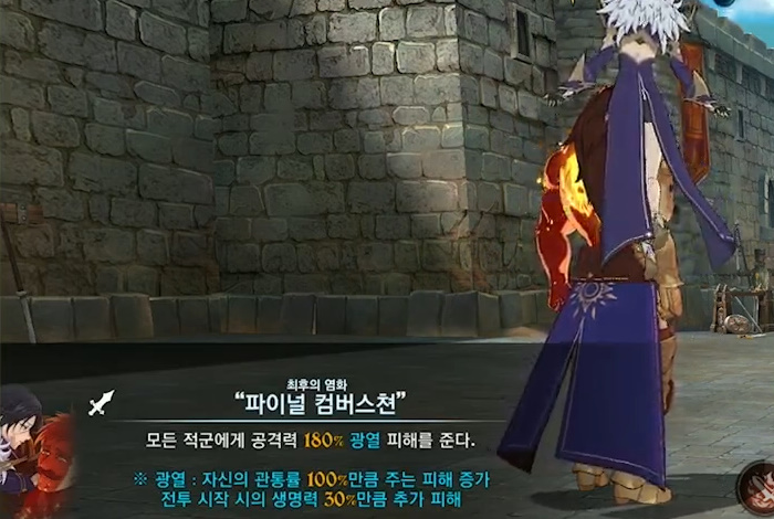 다음으로 전체기 '파이널 컴버스쳔'은 자신의 관통률을 기준으로 100%만큼 주는 피해 증가 및 전투 시작 시의 생명력 30% 추가 피해를 주는 광열 피해를 준다. (1랭크 기준)