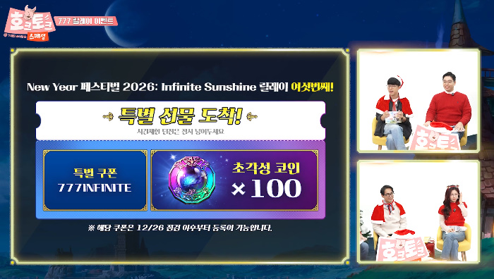 여섯 번째 특전으로는 특별 쿠폰이 마련됐다. 1차 특별 쿠폰 번호는 '777INFINITE'로, 초각성 코인 100개를 획득할 수 있다.