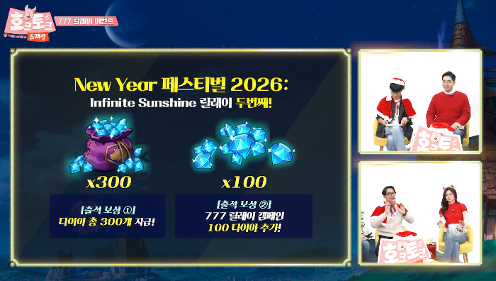 신년 페스티벌 2026의 777 릴레이 이벤트에서는 출석 보상으로 100 다이아의 특별 선물을 제공하며, 출석 이벤트를 통해 총 300 다이아를 추가로 획득할 수 있다. 즉 접속만으로도 400 다이아를 얻을 수 있는 셈이다.
