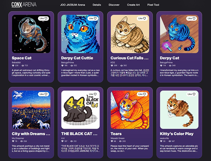 CONX 아레나의 두 번째 프로젝트 ‘주재범 아레나’는 CONX가 다양한 문화 산업으로 확장하는 상징적인 프로젝트다. AI를 활용한 2차 창작을 장려해 커뮤니티 참여를 활성화하고 CONX의 독창적인 보상 구조를 적용하는 데 초점을 맞췄다. 이번 프로젝트의 참가자들은 지정된 사진을 활용해 자신의 개성을 담은 픽셀 아트 아이디어를 제출했으며, 공모 기간 동안 총 344건의 아이디어가 접수되며 높은 관심을 기록했다.