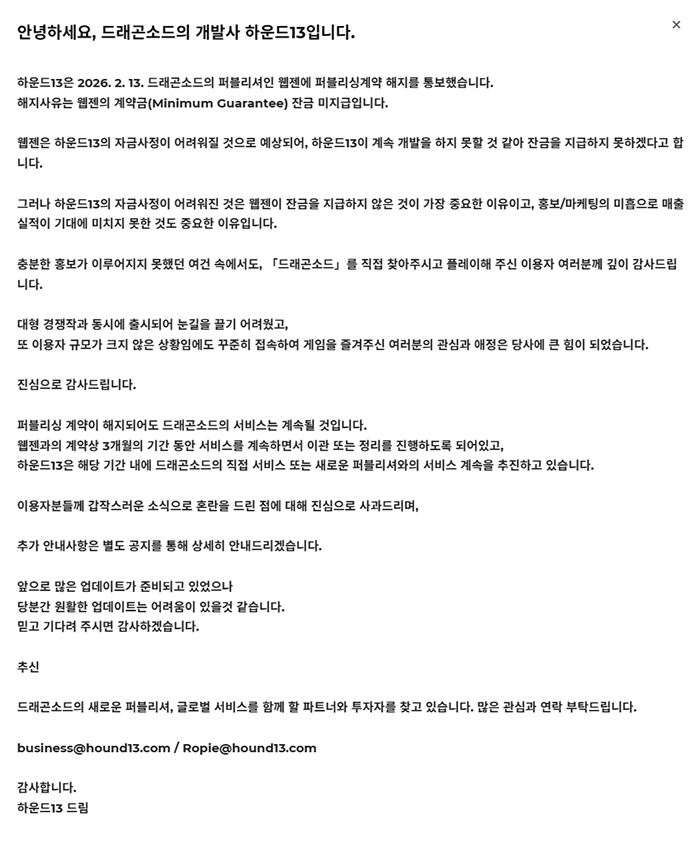 1월 21일 출시된 신작 게임 '드래곤소드'의 개발사 '하운드13'이 지난 2월 13일, 퍼블리셔인 '웹젠'을 상대로 퍼블리싱 계약 해지를 통보했다고 공식 입장을 발표했다.
