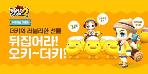 이와 함께 5월 26일까지 어린이날 분위기로 꾸며진 이벤트 맵 '오키 더키 하우스'를 오픈한다. 해당 맵에서 '접속 유지 이벤트'나 '오늘의 미션' 등으로 획득한 '더키볼 기념 주화'를 사용하면 ‘뒤집어라! 오키 더키!' 게임에 참여할 수 있으며, 게임을 통해 탈 것, 액션 스킬북, 장비 아이템 등의 다양한 선물을 받을 수 있다.