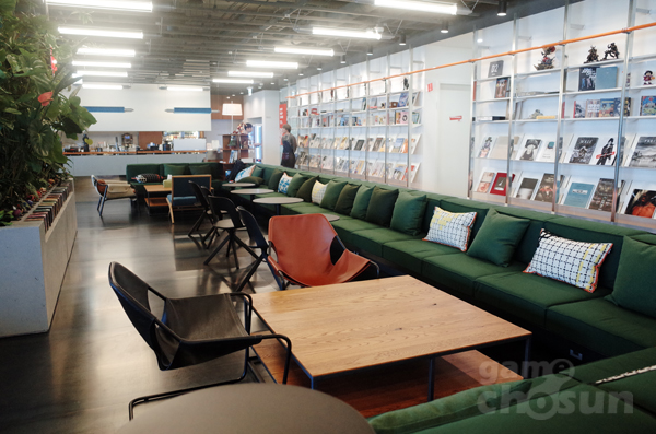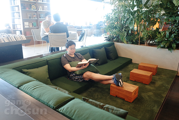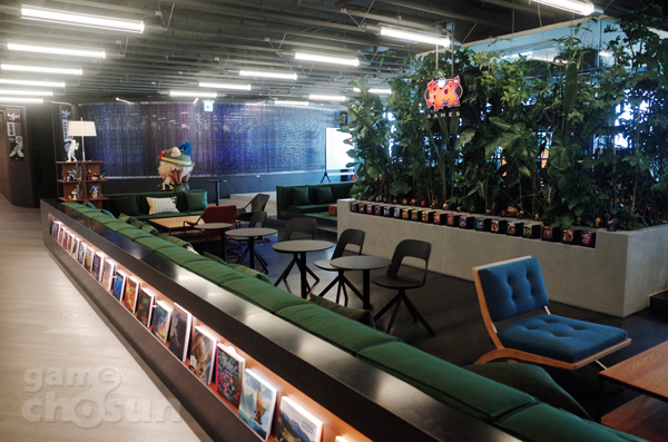 이 휴게 공간은 음악 CD나 서적, 피규어 등 직원들의 실제 소장품이 구비된 공간입니다. 그만큼 직원들이 편안하게 휴식하고, 창의적인 생각을 할 수 있도록 만들어졌습니다.