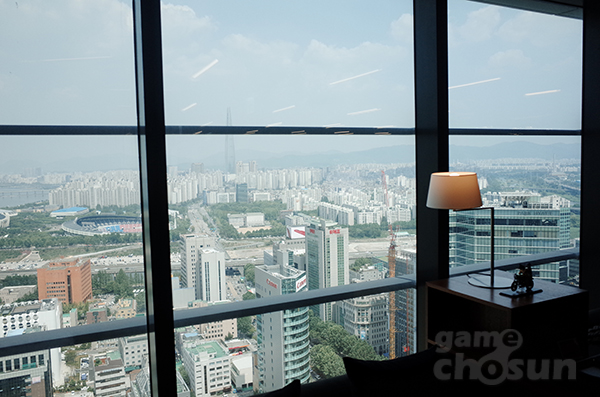 눈을 돌리자 시원시원한 창문 뷰가 들어옵니다. 라이엇게임즈의 휴게실은 강남 한복판 빌딩 30층에 위치한 만큼 탁 트인 시야를 자랑합니다. 저 멀리 잠실 운동장이 보이네요.