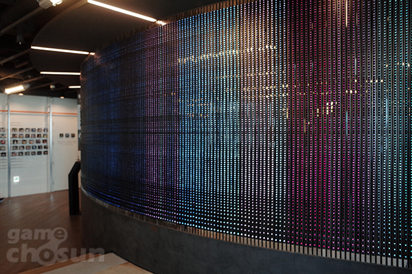 휴게 공간 한 켠을 차지하고 있는 이 거대한 디스플레이는 롤 챔피언의 이름을 입력하면 해당 챔피언의 대표 색채가 표현되는 곳입니다. 사진의 저 색은 카직스였던 것으로 기억합니다.