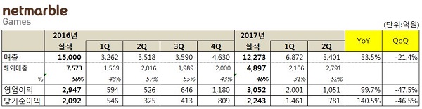 넷마블게임즈(이하 넷마블, 대표 권영식)는 올해 2분기 연결기준 매출액 5401억원, 영업이익 1051억원, 당기순이익 781억원으로 전년 동기 대비 각각 53.5%, 99.7%, 140.5% 증가했다고 밝혔다. 전분기 대비 매출 21.4%, 영업이익 47.5%, 당기순이익 46.5% 감소한 수치다.