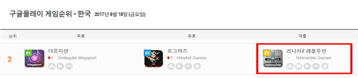 모바일 게임 순위 분석 사이트 게볼루션에 따르면 리니지M이 출시되기 전까지 구글플레이 매출순위 1위를 지키고 있었고, 18일 기준 2위를 기록중이다.
