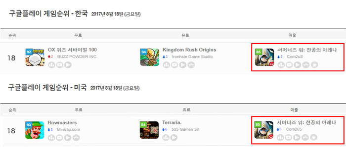 게볼루션에 따르면 18일 기준 국내 구글플레이 매출순위에서 18위를 기록 중이며, 글로벌 구글플레이 매출순위 역시 18위이다. 출시된지 3년 지난 게임의 매출순위라는 것을 감안하면 주목할만한 수준이다.