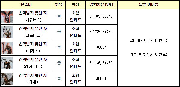 사냥 중 일정 확률로 이벤트 아이템인 가속 물약 상자와 날이 빠진 무기를 얻을 수 있다. 가속 물약 상자에선 용기 물약 등이 담겨있으며 '날이 빠진 무기'는 10개를 수집해 '버림받은 자들의 각인장비상자' 1개로 제작할 수 있다. 이를 개봉하면 악마왕의 무기 등 24종의 일반 ~ 영웅 등급 장비 중 하나를 획득할 수 있다.