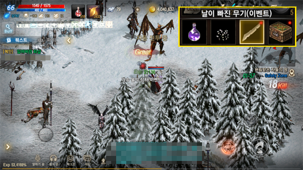 참고로 이벤트 아이템인 날이 빠진 무기는 같은 2시간 동안 4개만 획득한 유저가 있는가 하면, 50여개를 획득한 유저도 있어 랜덤 드랍으로 보인다.