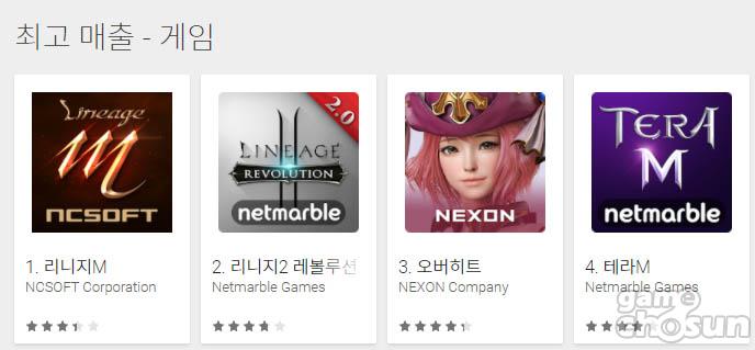29일 오전 구글플레이 게임 부문 최고매출 순위에 따르면 넥슨의 수집형 RPG(역할수행게임) '오버히트'가 3위, 넷마블게임즈의 MMORPG '테라M'이 4위를 차지했다.