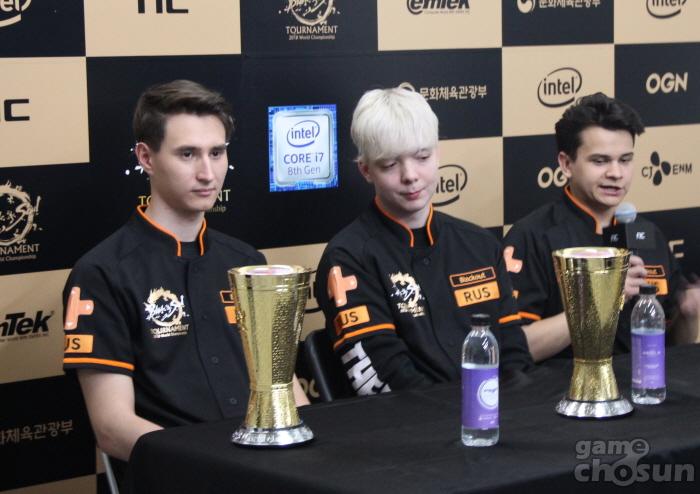 엔씨소프트(대표 김택진, 이하 엔씨)의 e스포츠 대회 ‘인텔 블레이드 & 소울(이하 블소) 토너먼트 2018 월드 챔피언십(이하 월드 챔피언십)’에서 결선 4대0, 결승 4대0이라는 퍼펙트 스코어로 우승을 차지한 러시아의 블랙아웃 팀의 인터뷰가 15일 진행됐다.