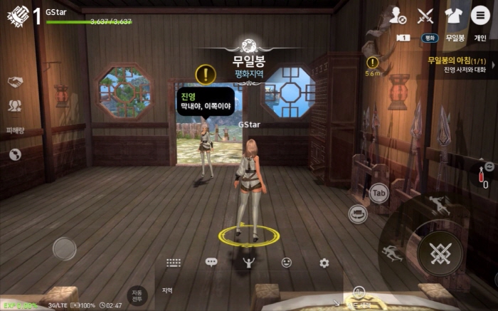 조작의 경우 기본 모드에서는 왼쪽 가상 패드로 방향을 정하고 오른쪽 행동 패드에서 달리기, 경공 등을 사용할 수 있어 이동을 모바일 환경에 맞게 간편하게 구현한 것이 느껴졌다.