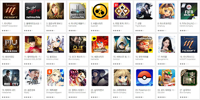 2019년 3월 4일 구글플레이 게임부문 최고 매출 순위 갈무리
