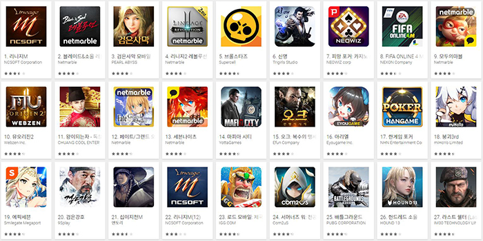 2019년 3월 11일 구글플레이 게임부문 최고 매출 순위 갈무리