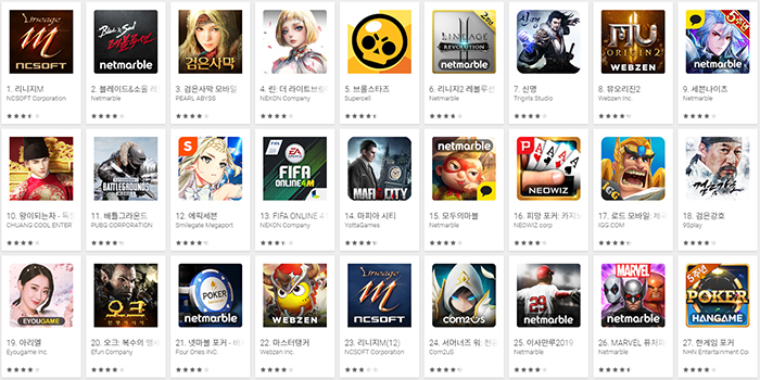 2019년 3월 25일 구글플레이 게임부문 최고 매출 순위 갈무리