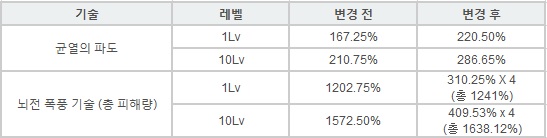 [전광] 기술의 시전 시간이 대폭 감소하고 다음 기술로의 연계가 빠르도록 개선했다. 또, [잔류 번개], [균열의 파도] 기술의 공격 준비 시간을 감소시켰으며 [균열의 파도] 기술에 '기술 사용 중 슈퍼아머' 효과를 추가 및 좌우 공격 범위를 10% 증가시켰다. 이외에도 [뇌전 폭풍] 기술의 타격 수를 1에서 4로 변경했다.