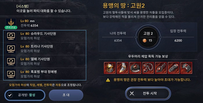 용맹의 땅에 AI 매칭 시스템이 추가됨에 따라 파티원이 모이지 않는 경우에도 효율적인 보상 획득이 가능해졌다. 용맹의 땅 공개방을 생성 후 60초 간 파티원이 모이지 않는 경우 권장 전투력에 맞는 AI 캐릭터가 파티에 합류하게 된다.