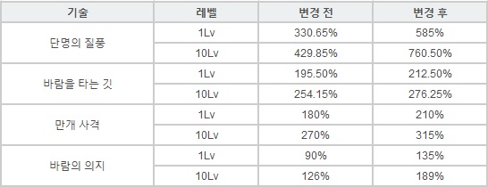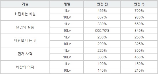 [회전 베기] 기술의 '슈퍼 아머' 효과를 삭제하는 대신, [단명의 질풍] 기술에 '기술 사용 중 슈퍼 아머' 효과를 추가했다. 또 '넉다운' 효과를 '기절'로 변경했다. 재사용 대기 시간은 1초 감소했으며 다음 기술로의 연계가 빠르도록 개선했다. [화살 분출] 기술의 화살 속도 및 사거리를 상향하고 '넉다운' 효과를 추가했다.