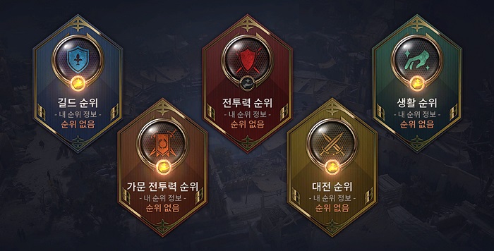 순위 개편 및 간소화를 통해 길드/ 가문 전투력/ 전투력/ 대전/ 생활 순위의 랭킹을 확인할 수 있으며 서버 전체/ 소속 서버/ 친구 및 길드원 별로 순위를 확인하는 것도 가능하다.