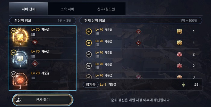 이번 순위 개편에서 가장 눈여겨봐야할 것은 '찬사하기'다. 찬사하기는 1일 1휘, 서버 전체 1위부터 3위까지 찬사를 보낼 수 있는 기능인데, 이를 이용할 경우 보상으로 '블랙펄'이 주어진다.