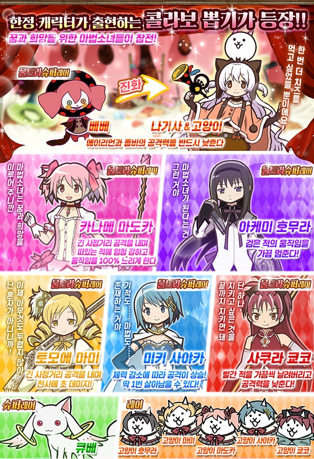 이벤트 개최 기간 중, 고양이 기지에서「레어 뽑기」버튼을 탭 하면 콜라보 한정 캐릭터가 출현하는 「마법소녀 마도카☆마기카」 뽑기가 개최된다.