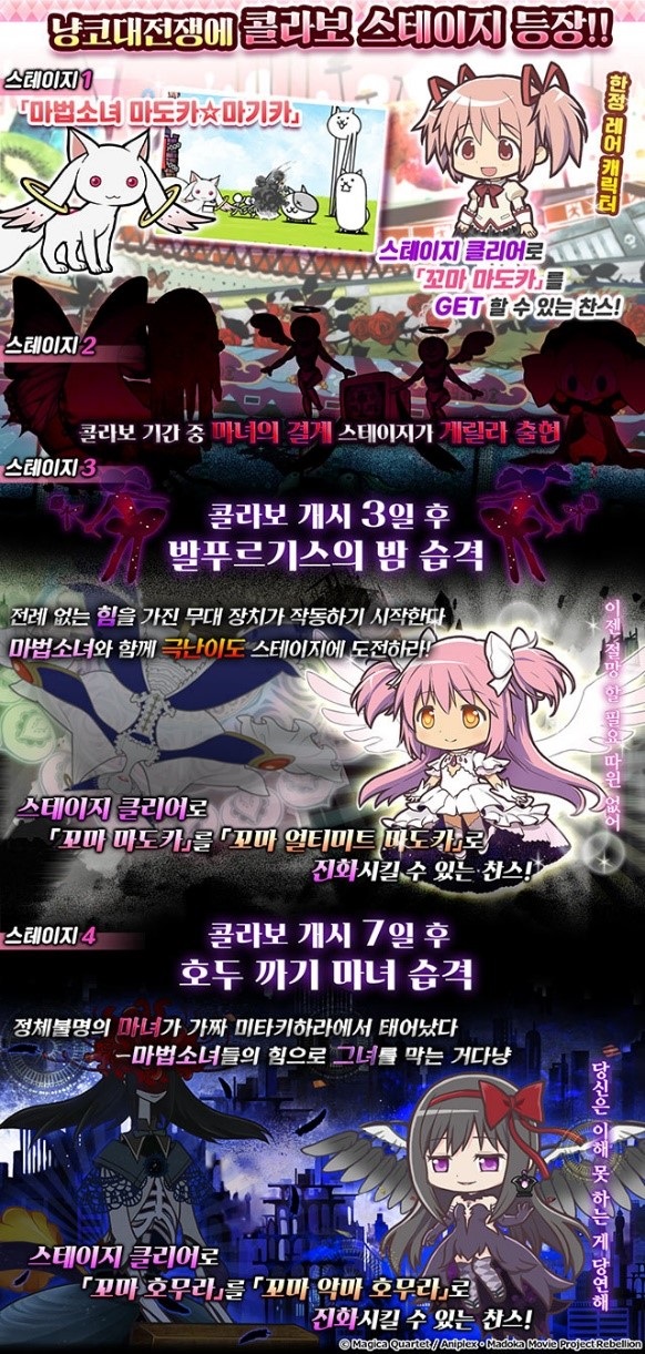 [자료제공= 포노스] 주식회사 포노스(대표: 츠지코 요리카츠)는 병맛&귀염 타워디펜스 게임을 대표하는 <냥코대전쟁> 에서 지난 2019년 5월 27일부터 「극장판 마법소녀 마도카☆마기카:【신편】반역의 이야기」와의 콜라보레이션을 기념하여 이벤트를 개최 중이다고 밝혔다.