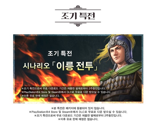 Windows®와 PlayStation®4의 조기 특전으로, 유비가 관우의 복수를 이루기 위해 손권을 공격한 이릉 전투를 PlayStation™Store 및 Steam®에서 발매일로부터 2주 동안 무료로 다운로드를 할 수 있다. 이후 유료 판매의 예정이 없으므로, 이릉 전투를 즐기기 위해서는 해당 기간 내에 무료 다운로드를 받을 필요가 있다.