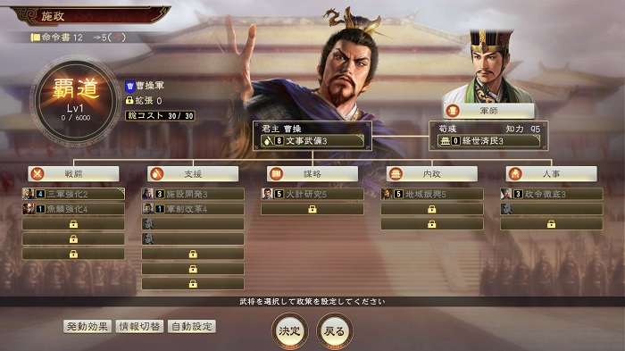 본 작품에서는 플레이어의 전략의 폭을 넓혀주는 요소로 세력의 중추라고도 할 수 있는 「시정」을 조직할 수 있다. 「시정」은 조직도로 표현되며, 휘하 무장을 조직도에 편성함으로써 세력은 다양한 커맨드나 효과를 획득해 간다. 자신의 전략에 맞는 「시정」 구성이 중요해진다.