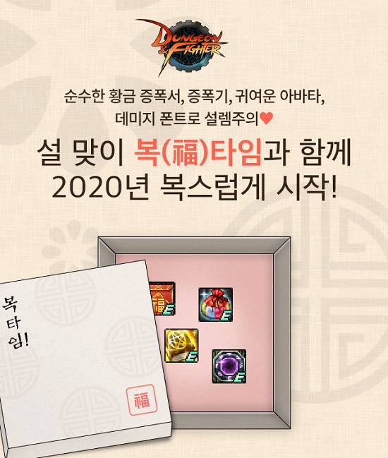 ‘던전앤파이터’에서는 30일까지 게임 접속 10분을 유지할 경우 매일 다양한 선물을 얻을 수 있는 ‘복타임 선물 상자’를 제공한다. 또 누적 참여 횟수에 따라 ‘하얀 쥐 아바타 2부위’, ‘레전더리 휘장 선택 상자’, ‘순수한 황금 증폭서’ 등 추가 선물을 지급한다.
