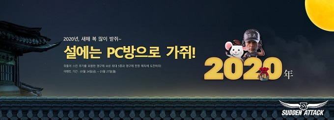 ‘서든어택’에서는 2월 20일까지 ‘TRG21(IS) 쥐돌이’, ‘AK47(IS) 쥐돌이’ 등 쥐 캐릭터 스킨 무기 8종을 새롭게 선보인다. 해당 무기 3종 이상 보유한 유저에게는 경험치 20% 증가 등의 혜택을 제공한다. 또 23일부터 30일까지 인기 맵 ‘민속촌’에 겨울 스킨을 적용하고 배경음악을 국악으로 변경한다. 이 밖에 24일부터 27일까지 PC방에서 ‘서든어택’을 즐기면 누적 접속 시간에 따라 10만 통합 경험치, ‘[NEW] 윈체스터(S) 밀리터리(영구제)’ 등을 보상으로 제공한다.