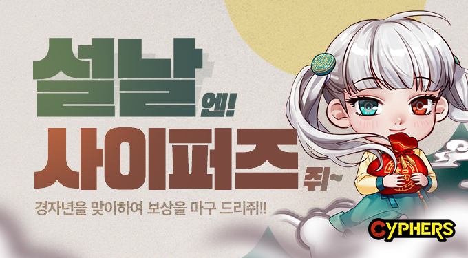 ‘사이퍼즈’에서는 28일까지 매일 1회 게임을 플레이 할 경우 ‘비단 주머니’, ‘100주화 박스’, ‘덕담 외침권’을 지급하고, 설 연휴 동안 10회 플레이할 경우 ‘선택형 [경자년] 프레임’, ‘르블랑 옷감상자’, ‘코스튬 도안’을 선물한다.